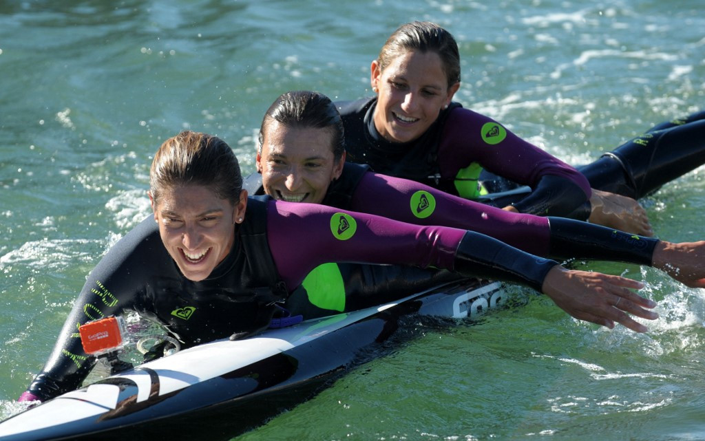 Paddling the Pacific: Paddleboarders Alexandra Lux, Stephanie Geyer Barneix and Itziar Abascal paddle in the water after their second test crossing Lo